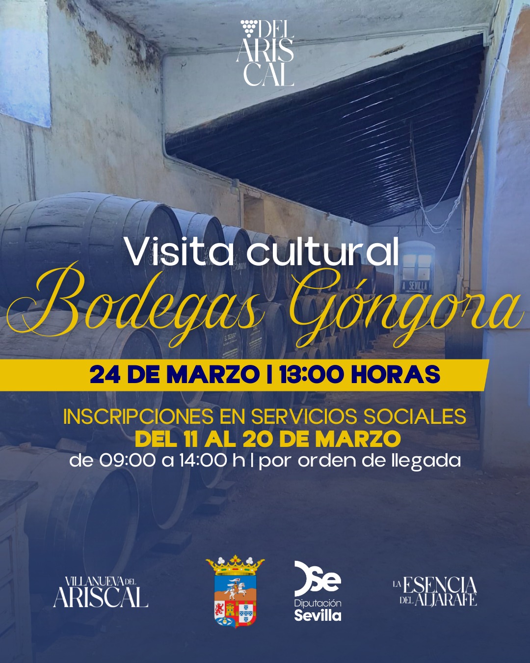 El próximo 24 de marzo, a las 13:00 horas, tienes la oportunidad de conocer Bodegas Góngora, bodega del siglo XVI y primera bodega exportadora de Sevilla, con una visita cultural organizada por el Ayuntamiento de Villanueva del Ariscal dentro del Programa de Dinamización y Fomento de valores ciudadanos.