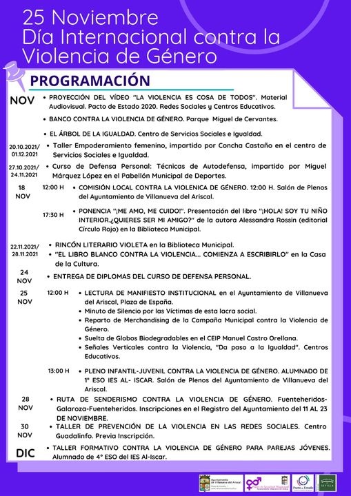 Aquí os dejamos el cartel con las numerosas actividades preparadas desde la delegación de Igualdad del Ayuntamiento de Villanueva del Ariscal con motivo del 25N DÍA INTERNACIONAL CONTRA LA VIOLENCIA DE GÉNERO. Esperamos vuestra participación.