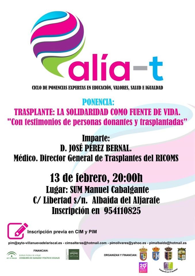 Próximo Jueves, 13 de febrero de 2020 a las 20 horas en el SUM Municipal Manuel Cabalgante. Nos acompañará el Doctor Don José Pérez Bernal, Director general de trasplantes del Real e Ilustre Colegio Oficial de Médicos de Sevilla (RICOMS). Durante su intervención contará con testimonios de donantes y trasplantados.