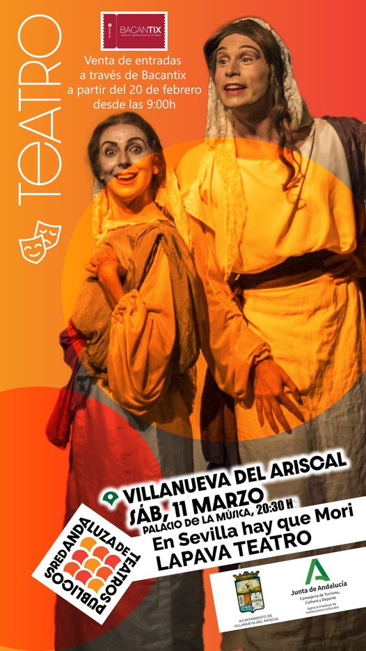 Lapava teatro nos hará reír el sábado 11 de marzo con su espectáculo "En Sevilla hay que morí". Será en el Palacio de la Música a las 20:30h y ya se pueden comprar de manera anticipada las entradas a través de Bacantix en el siguiente enlace https://www.bacantix.com/entradas/webforms/forms/venta.aspx?id=VillanuevaAriscal&codigo=000188001000012000012