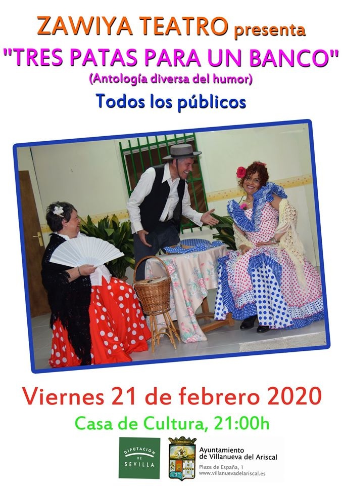 Zawiya Teatro nos vuelve a visitar para hacernos pasar un rato divertido, en esta ocasión con "Tres patas para un banco (antología diversa del humor)". Bajo este título, la compañía representará tres obras cortas dirigidas a todos los públicos: "Farsa del Cornudo Apaleado", "El Cerrojazo" y "La Paciencia de Don Gumersindo". Tres trabajos de estilos muy variados, el clásico,el costumbrista y el de vanguardia. No te lo pierdas el próximo viernes 21 de febrero a las 21:00h en la Casa de Cultura.