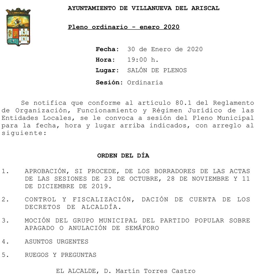 Os dejamos la convocatoria del Pleno Ordinario del mes de enero que se celebrará el día 30 a las 19h.