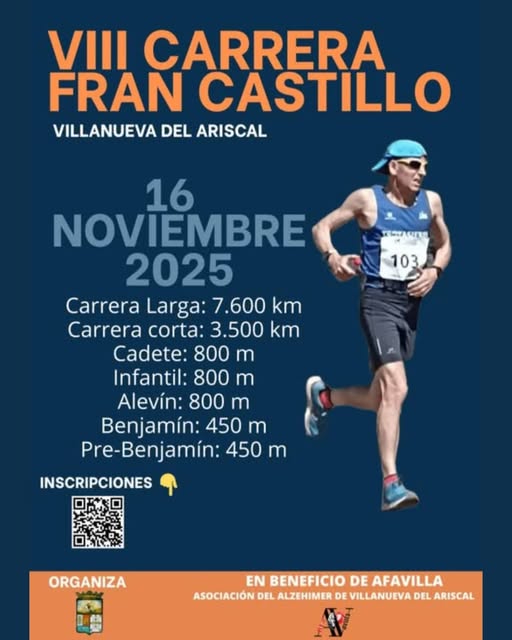7,6 kilómetros de distancia como carrera principal, con la inclusión de carrera corta y para diferentes categorías de edad, Villanueva del Ariscal celebrará una fiesta del deporte en la que lo recaudado se destinará a la asociación de nuestro municipio AFA VILLA, quien cuida de personas afectadas por el Alzheimer y a sus familias.