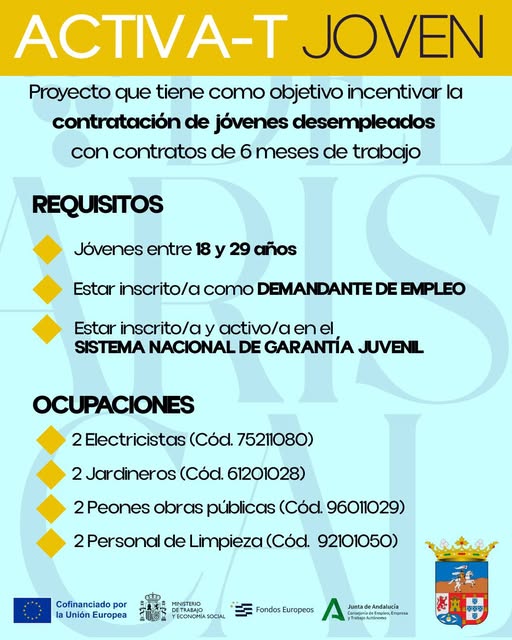 El Ayuntamiento de Villanueva del Ariscal pone en marcha el Programa Activa-T Joven, cuyo objetivo es fomentar la contratación de jóvenes desempleados y desempleadas mediante contratos de trabajo de seis meses de duración.