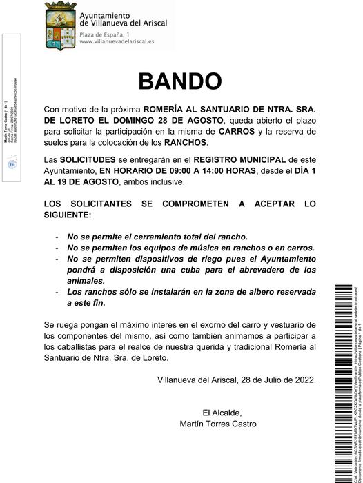 INFORMACIÓN DE INTERÉS: BANDO SOBRE LA ROMERÍA AL SANTUARIO DE NTRA. SRA. DE LORETO.