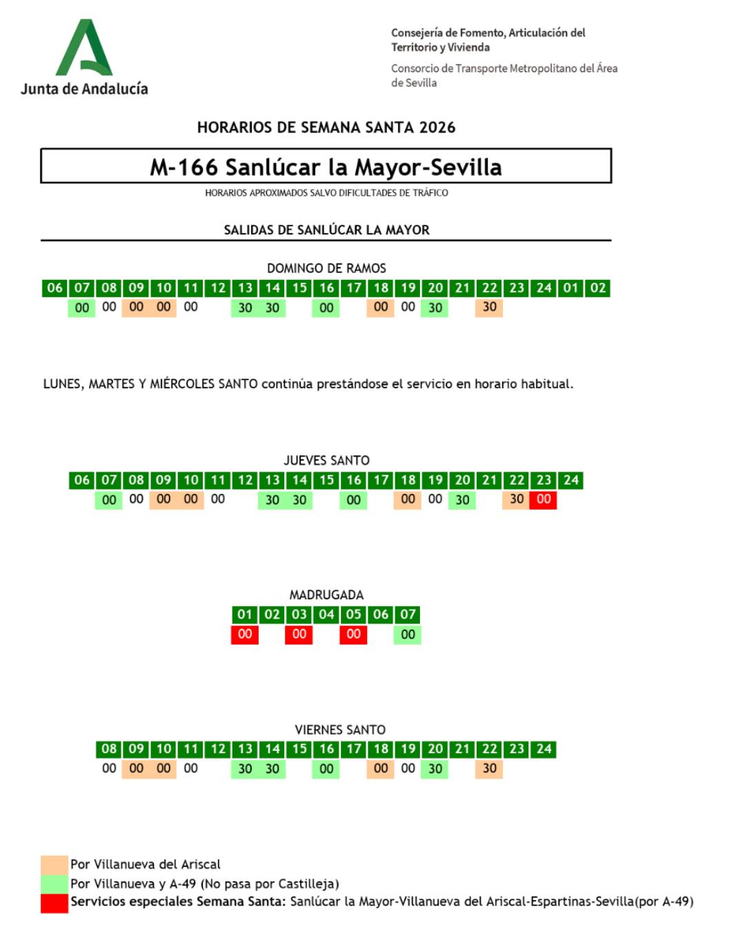 Compartimos con nuestra ciudadanía los horarios que ha hecho públicos el Consorcio de Transportes para la Línea M-166 con motivo de la celebración de la Semana Santa, los cuales también pueden ser consultados en la página web del propio Consorcio.