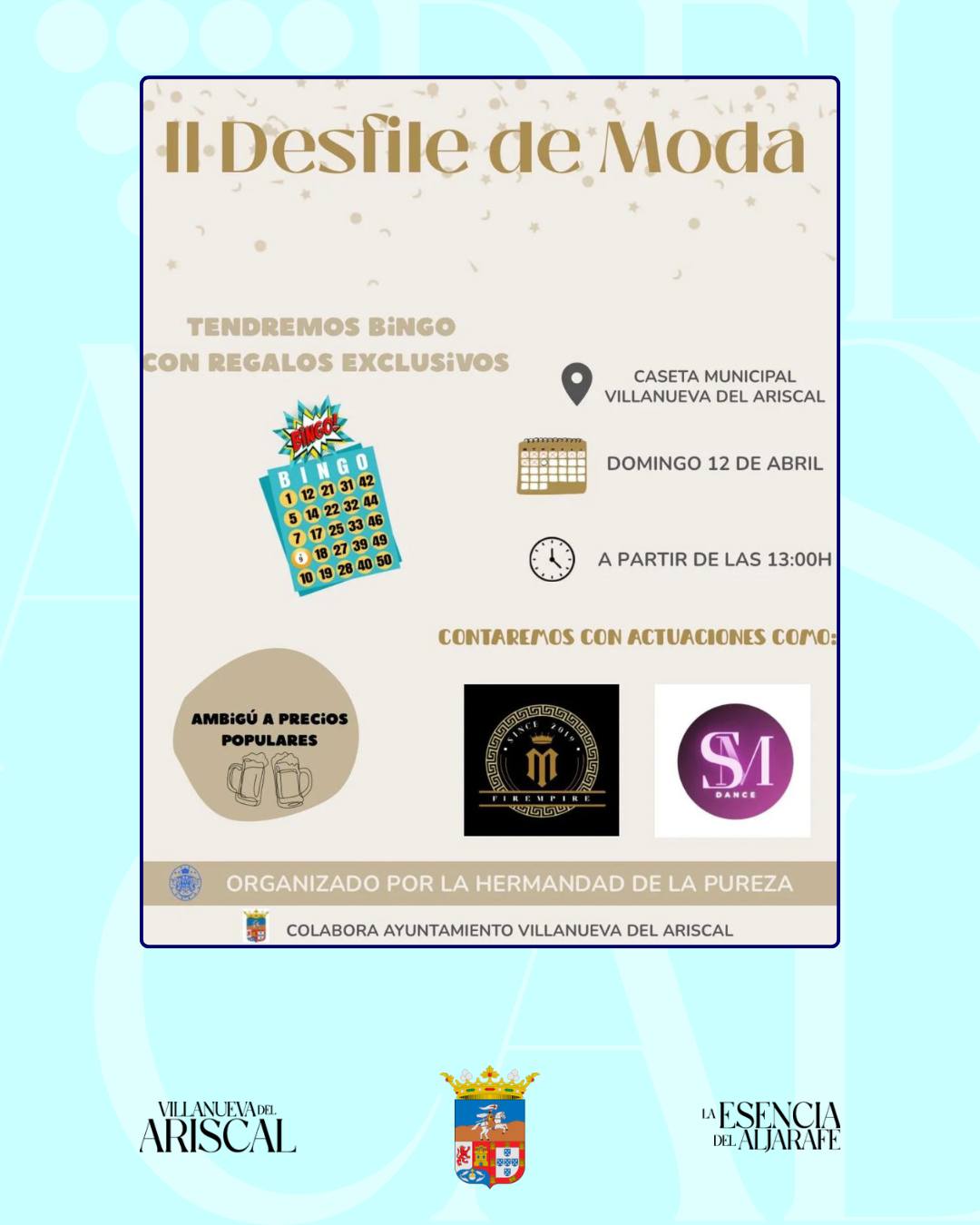 El próximo domingo 12 de abril, a partir de las 13:00 horas, la Caseta Municipal será escenario del II Desfile de Moda organizado por la Hermandad de la Pureza, con la colaboración del Ayuntamiento de Villanueva del Ariscal.