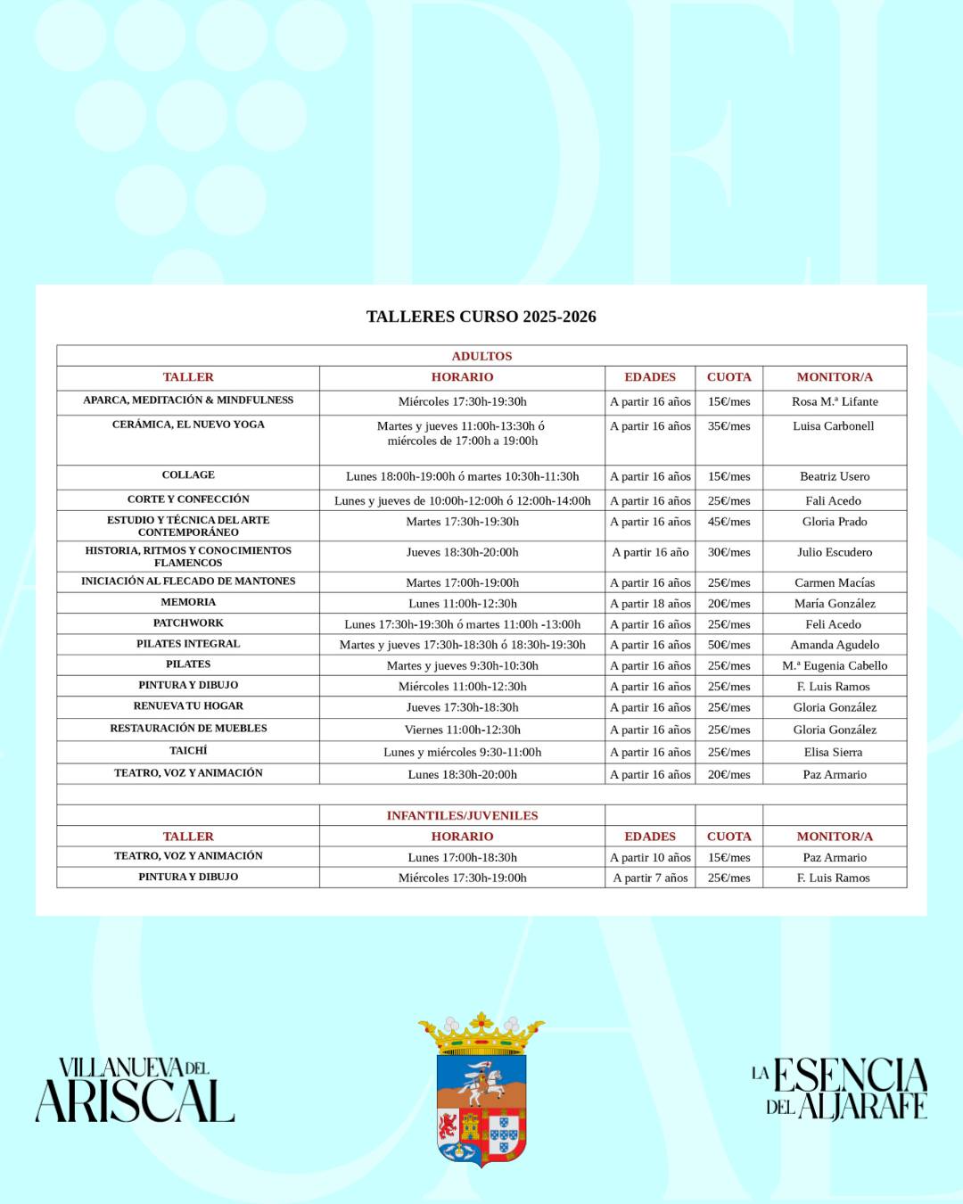 Desde el próximo lunes 15 de septiembre puedes sumarte a la completa oferta de talleres de animación socioculturales de la Asociación Ágora Cultural, que cuentan con la colaboración del Ayuntamiento de Villanueva del Ariscal.
