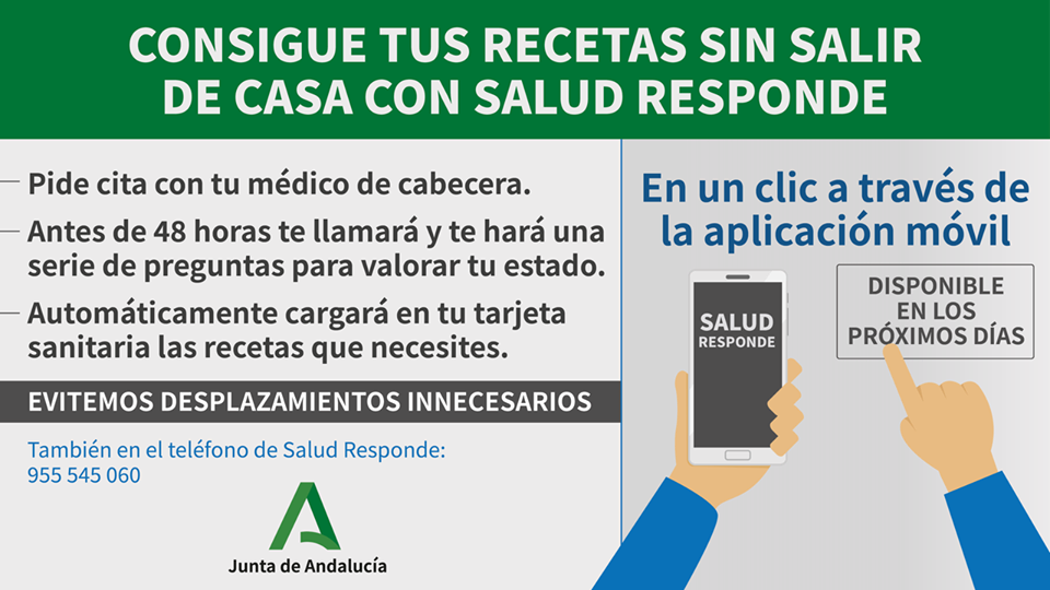 Nueva aplicación móvil al servicio de los andaluces para recibir atención sanitaria sin necesidad de salir de casa. Llama a tu médico de cabecera y consigue tus recetas con un solo clic. También puedes contactar con Salud Responde en el 955 545 060.