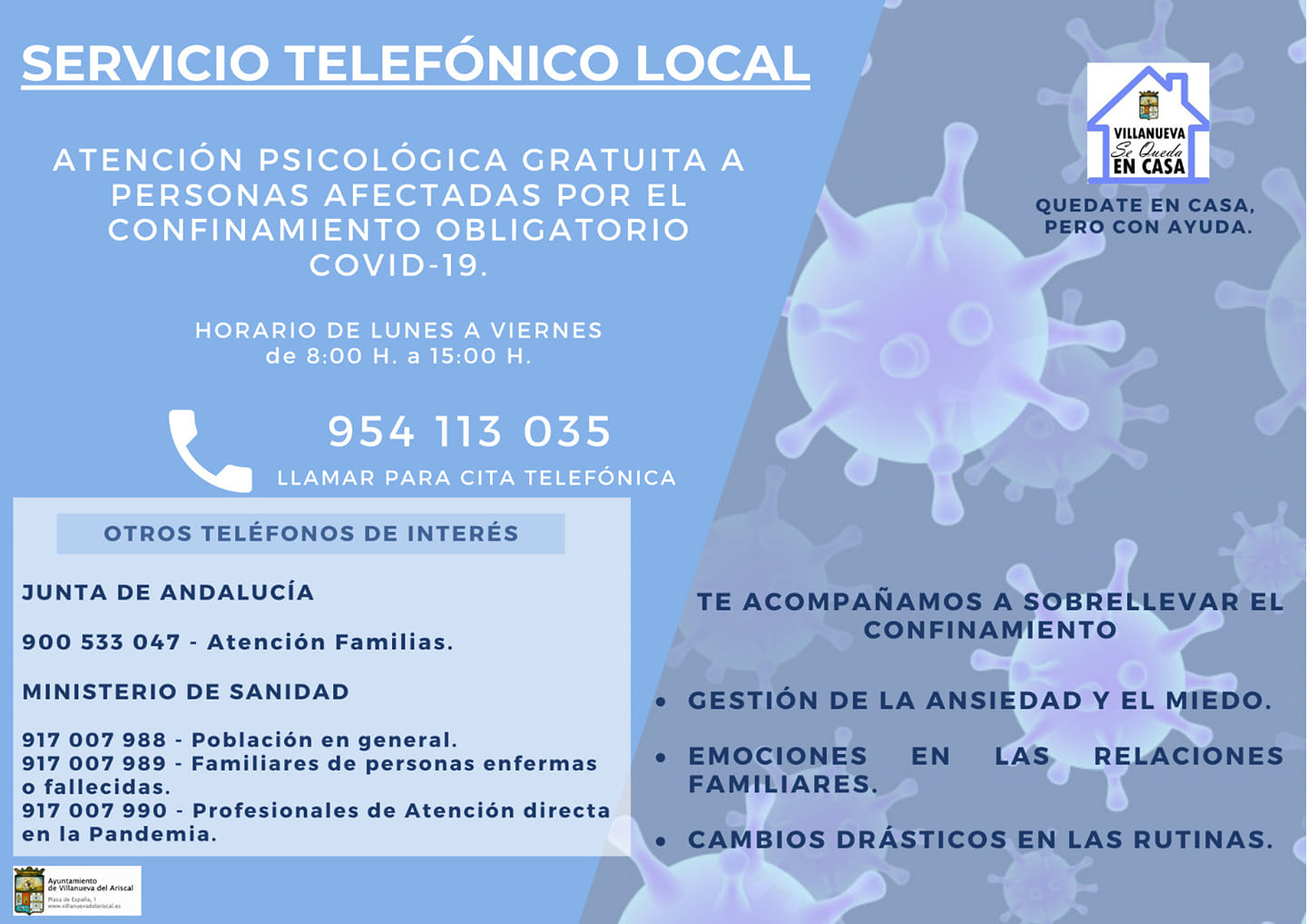 Desde nuestro Ayuntamiento queremos ofrecer un servicio gratuito de Atención Psicológica a las personas afectadas por el confinamiento obligatorio por el Covid-19.