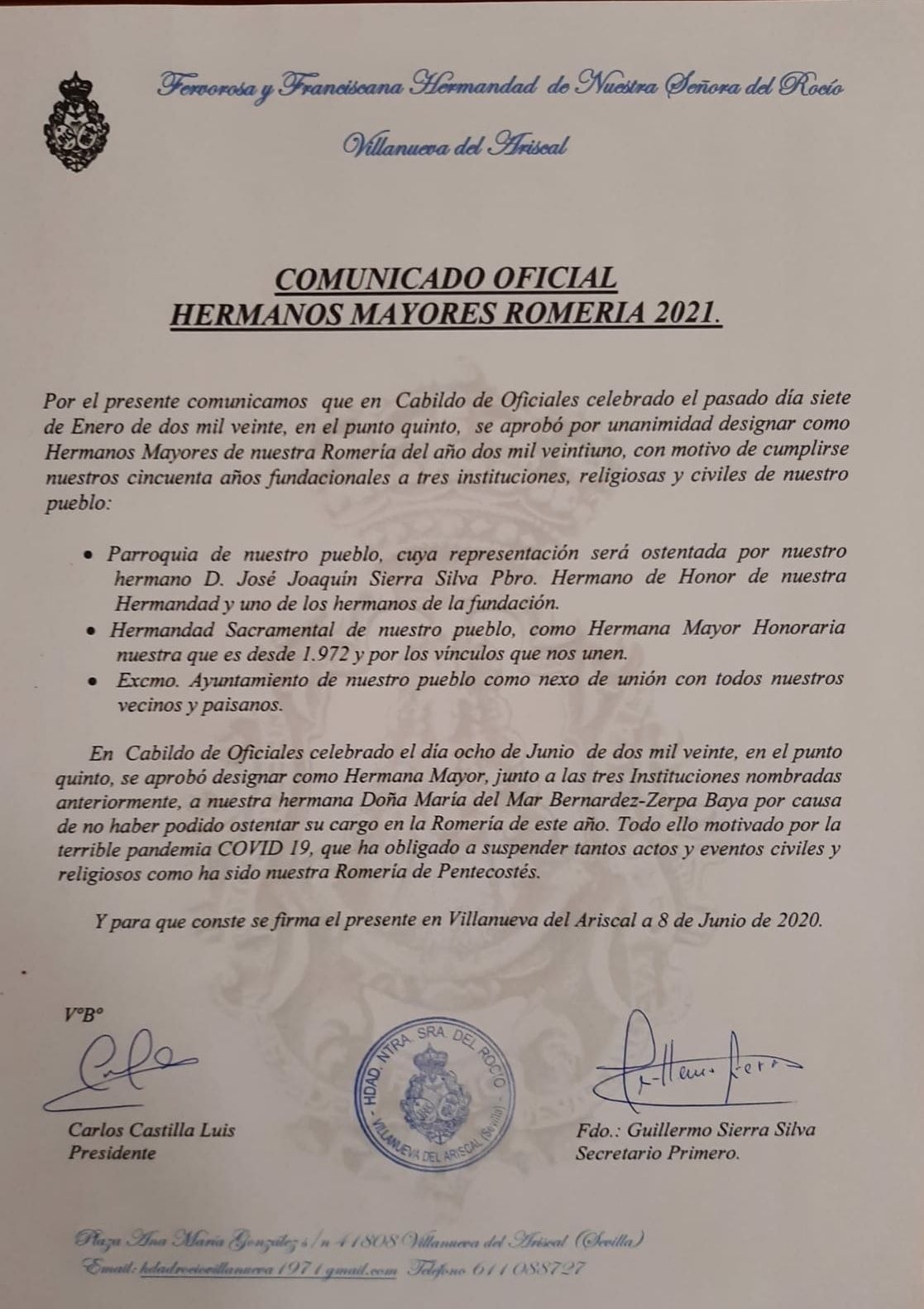 La Hdad. de Ntra Sra. del Rocío ha propuesto junto a la Parroquia y la Hdad. Sacramental a nuestro Ayuntamiento, como Hermano Mayor para la Romería de 2021 donde conmemoraremos el cuncuenta aniversario de la fundación de dicha hermandad.