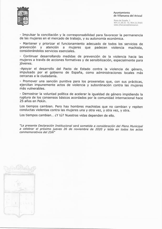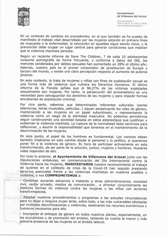 En nuestra localidad debemos agradecer a todas las personas que se implican cada día en esta lucha, trabajadores en general de nuestro Ayuntamiento, comunidad educativa y sanitaria, fuerzas de seguridad de nuestro pueblo y a todos los vecinos, jóvenes y adultos, que en general, luchamos para erradicar esta lacra y nos implicamos en denunciar y en no callar ante lo que vemos.