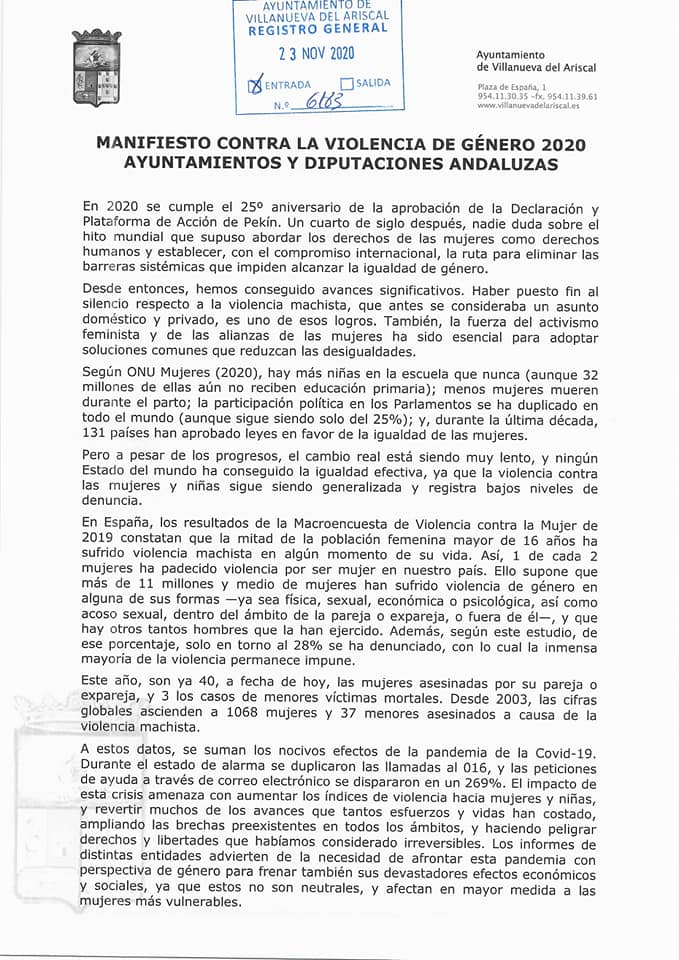 En la lluviosa mañana de ayer, nos hemos concentrado en el salón de Plenos del Ayuntamiento para leer el manifiesto 25N, concensuado por las ocho Diputaciones andaluzas y al que nuestro Ayuntamiento se ha adherido, y para mostrar nuestra repulsa a esta lacra social y nuestro apoyo a todas las víctimas guardando un minuto de silencio.