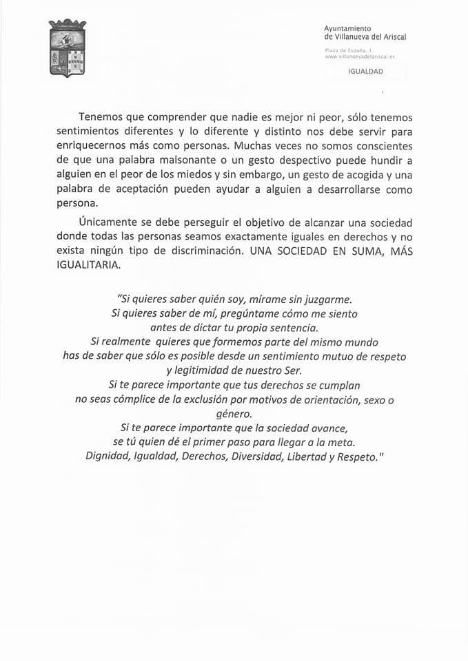 Desde aquí agradecemos a las personas que nos han querido acompañar su presencia, a la vez que animamos a todos nuestros vecinos a construir un pueblo en el que nadie se sienta rechazado por su orientación sexual, un pueblo en el que todo el mundo sienta la dignidad de ser persona, y donde decidir con quién compartir la vida y buscar la felicidad no suponga un problema ni una exclusión social.