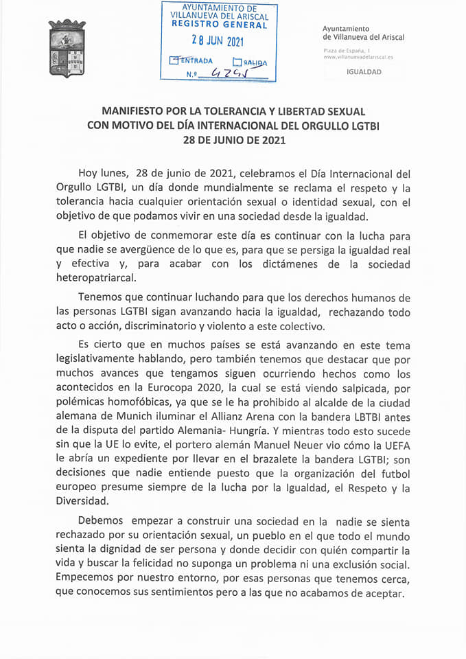 En la mañana de hoy ha tenido lugar la lectura del manifiesto por la tolerancia y libertad sexual con motivo del Día Internacional del Orgullo LGTBI en el patio del edificio de los Servicios Sociales Comunitarios.