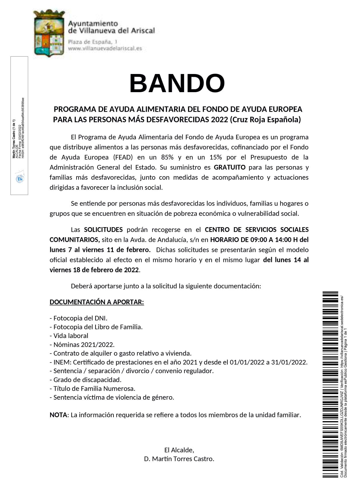 Aquí os dejamos este Bando informativo sobre la participación en el Programa de Ayuda Alimentaria (Alimentos Cruz Roja).