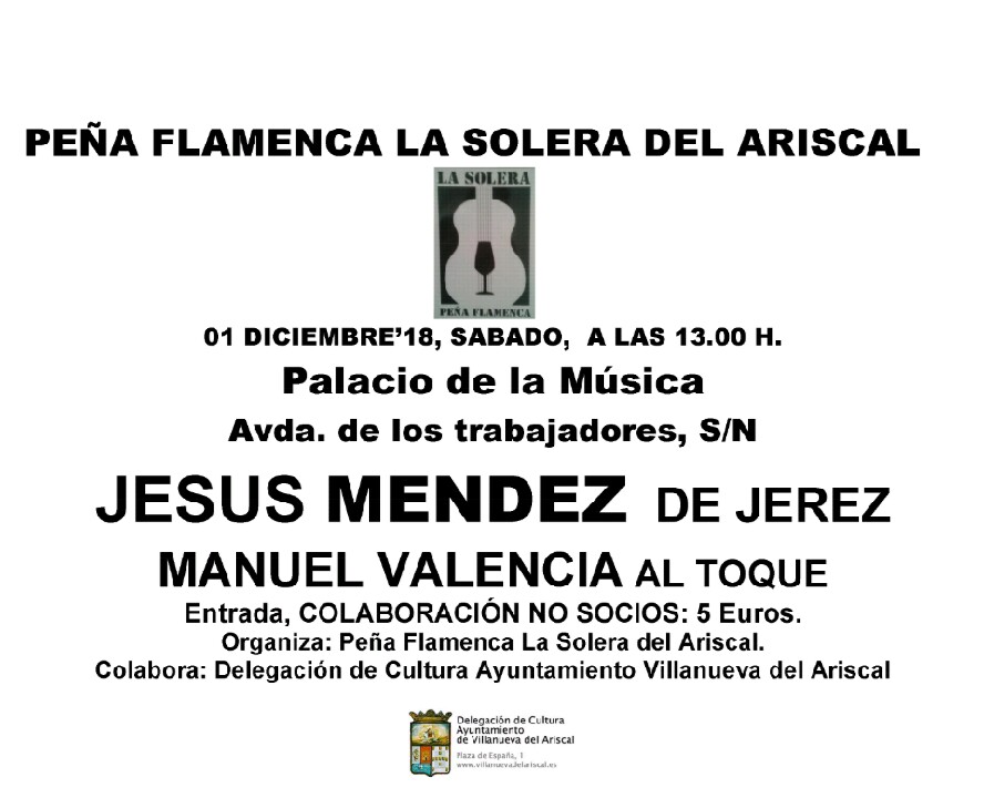 La Peña Flamenca "La Solera del Ariscal" ha organizado para este sábado 1 de diciembre a las 13:00 horas las actuaciones de Jesús Méndez de Jerez y Manuel Valencia al toque.