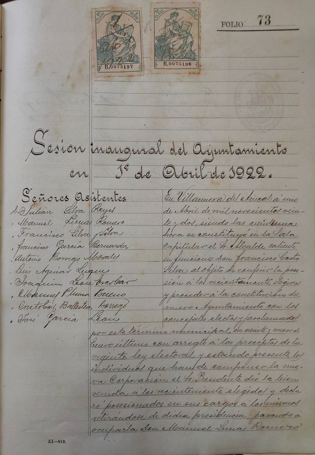 Haciendo coincidir mes y una centuria después, se nos antoja que el documento de este mes, sea esta acta: “Sesión inaugural del Ayuntamiento en 1º de abril de 1922”.