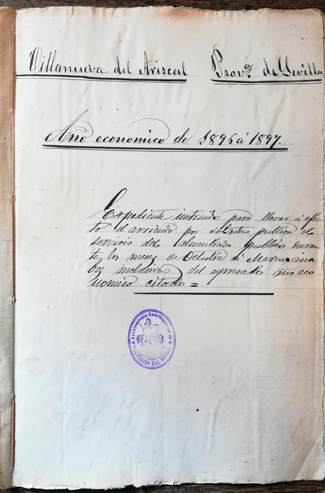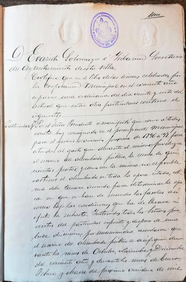 Siendo Secretario del Ayuntamiento D. Evaristo Sotomayor e Iribarren realizó este documento el 30 de junio de 1896. En él narra un acuerdo plenario por el cual se solicita salga a subasta pública la adjudicación del alumbrado público con un presupuesto anual de 500 pesetas.