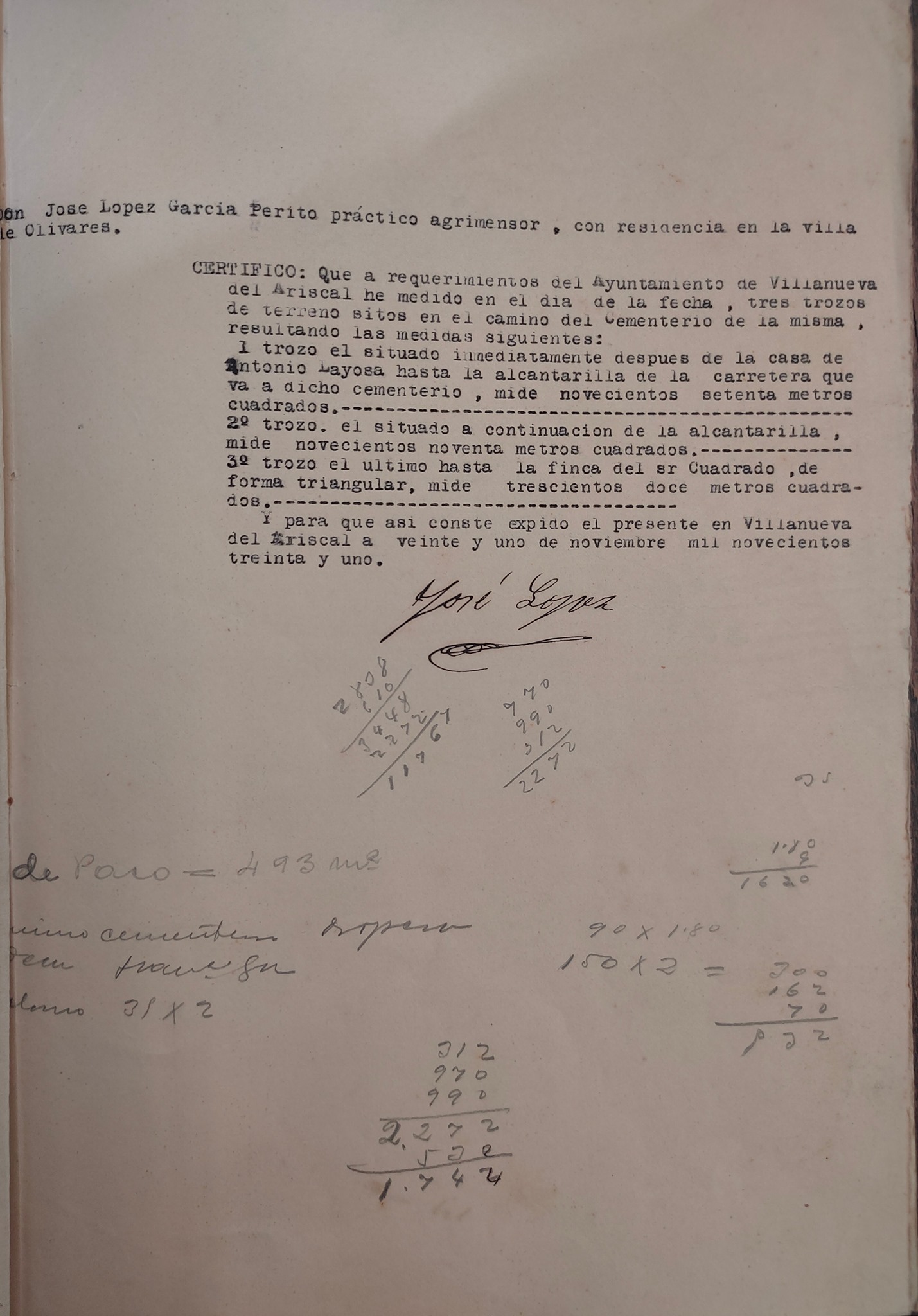 controversia, por valor de 1312 pesetas con 50 céntimos. Según nos dice el documento, la carretera debe medir 280 metros de larga por 5,5 metros de ancha. Todos los trámites finalizan con las mediciones que realiza el perito que viene desde Olivares, D. José López García, el día 21 de noviembre de 1931.
