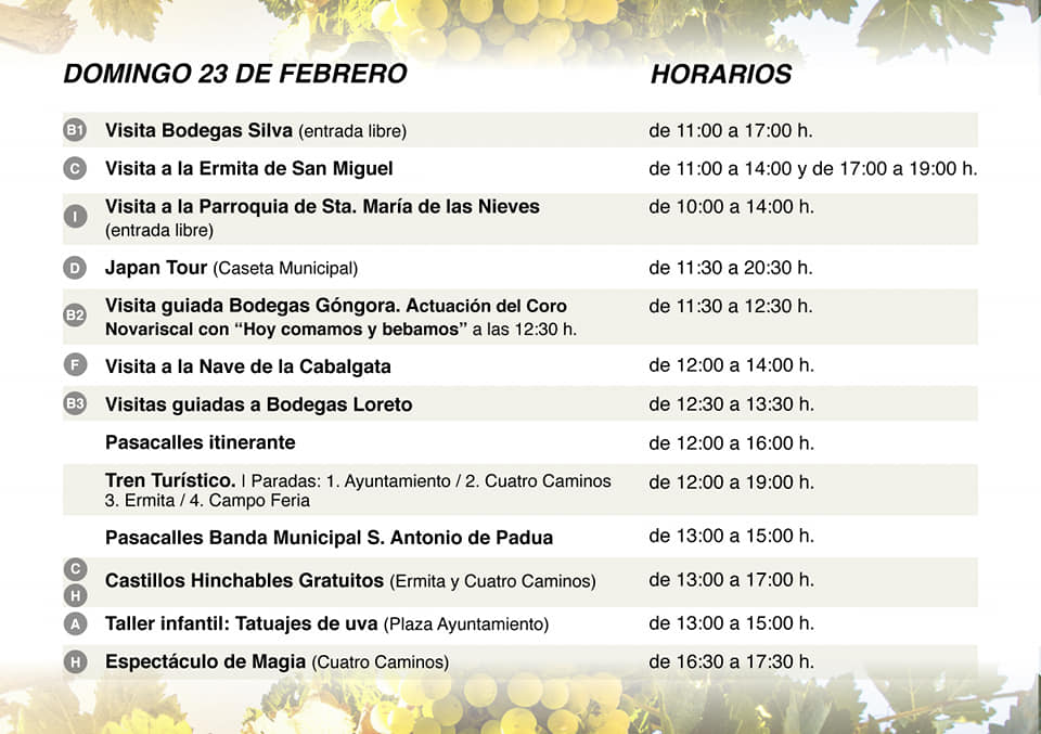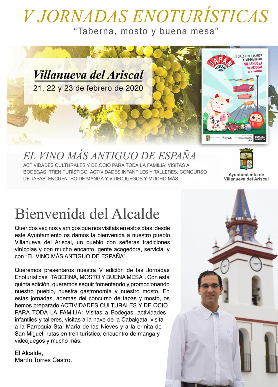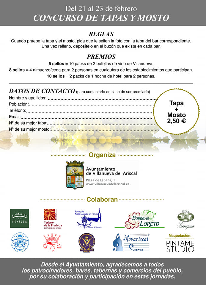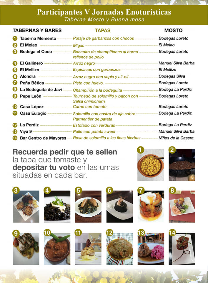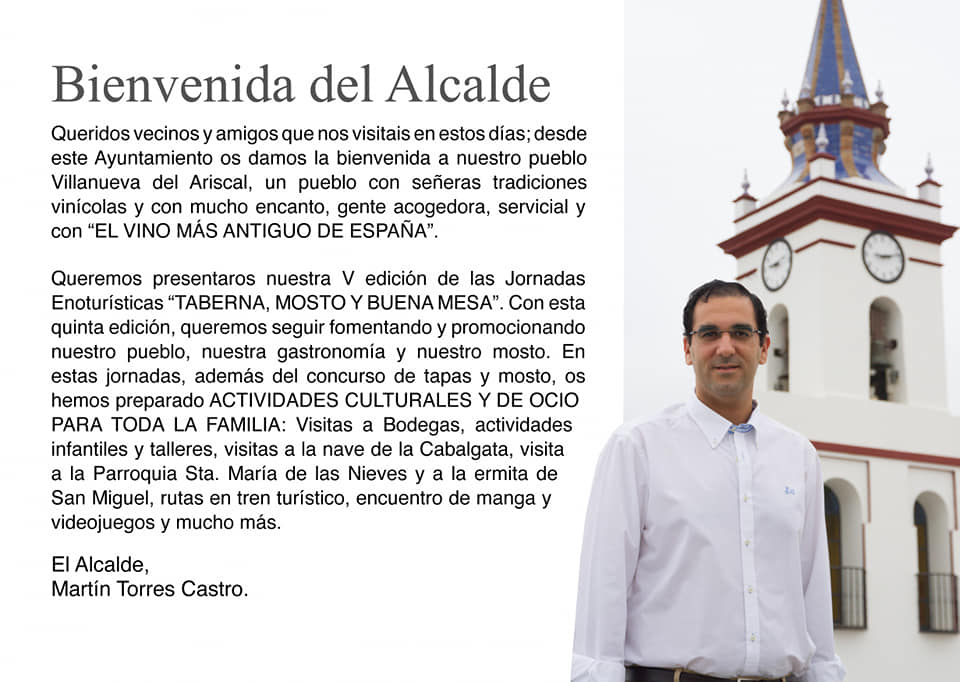Con esta edición queremos seguir fomentando y promocionando nuestro pueblo, nuestra gastronomía y nuestro mosto. A parte del CONCURSO DE TAPAS Y MOSTO, os hemos preparado ACTIVIDADES CULTURALES Y DE OCIO PARA TODA LA FAMILIA: visitas a bodegas, actividades infantiles y talleres, visitas a la nave de la Cabalgata, la Parroquia de Sta. María de las Nieves y a la Ermita de San Miguel, rutas en tren turístico, animación de calle y mucho más.