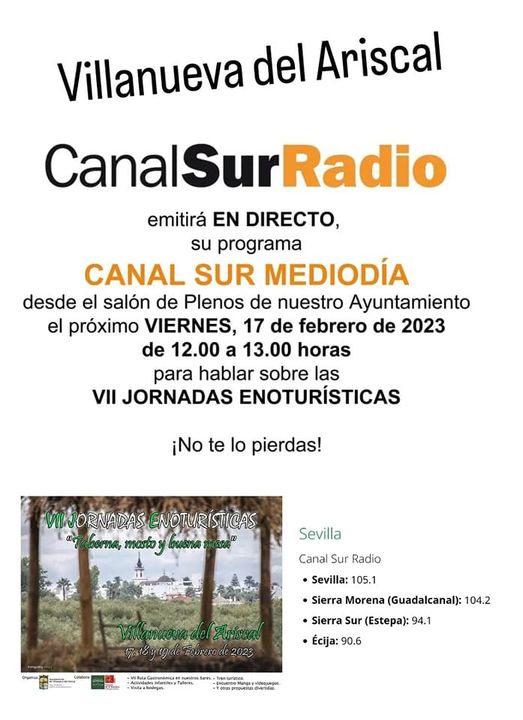Hoy viernes de 12.00 a 13.00 horas tendremos el programa Canal Sur Mediodía de Canal Sur Radio en el salón de Plenos de nuestro Ayuntamiento para hablar sobre nuestras VII Jornadas Enoturísticas.