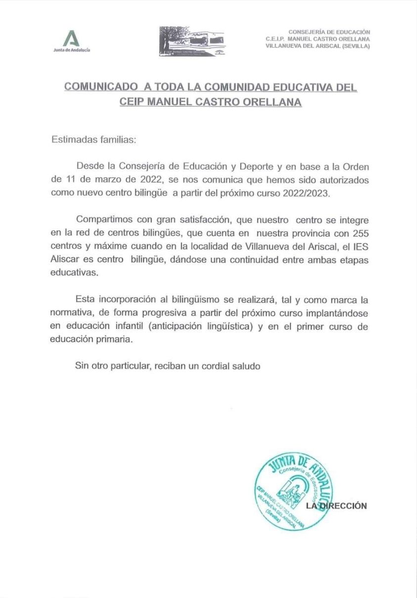 Al fin se corrige una disfunción en el sistema de nuestra localidad, donde el centro de primaria no era biligüe y sin embargo, el de secundaria, sí lo era. Esto provocaba un mayor periodo de adaptación del alumnado cuando pasaban de primaria a secundaria.