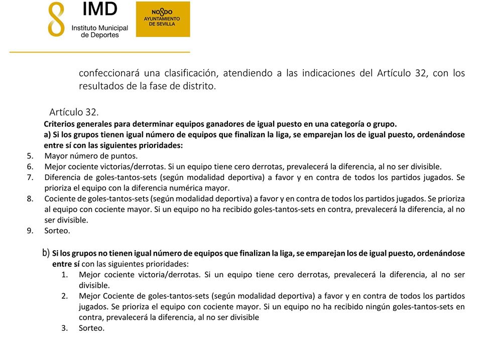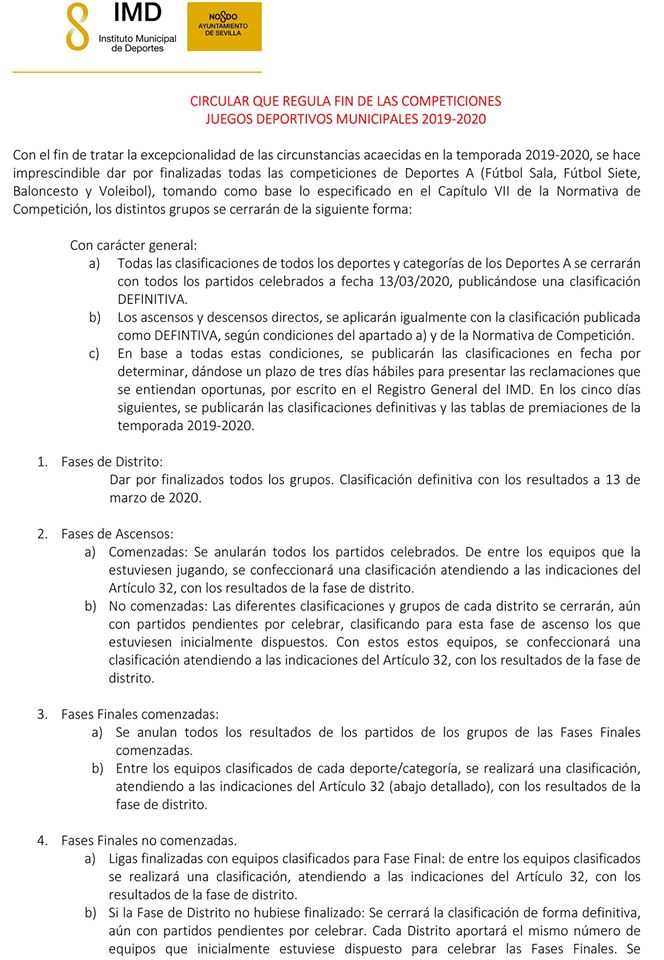 El IMD ha cursado comunicación a este Ayuntamiento en la que informa de la finalización definitiva de la temporada 2019-2020, de Deportes A (Fútbol Sala, Fútbol Siete, Baloncesto y Voleibol), tomando como base lo especificado en el Capítulo VII de la Normativa de Competición. Lo que se publica para general conocimiento.