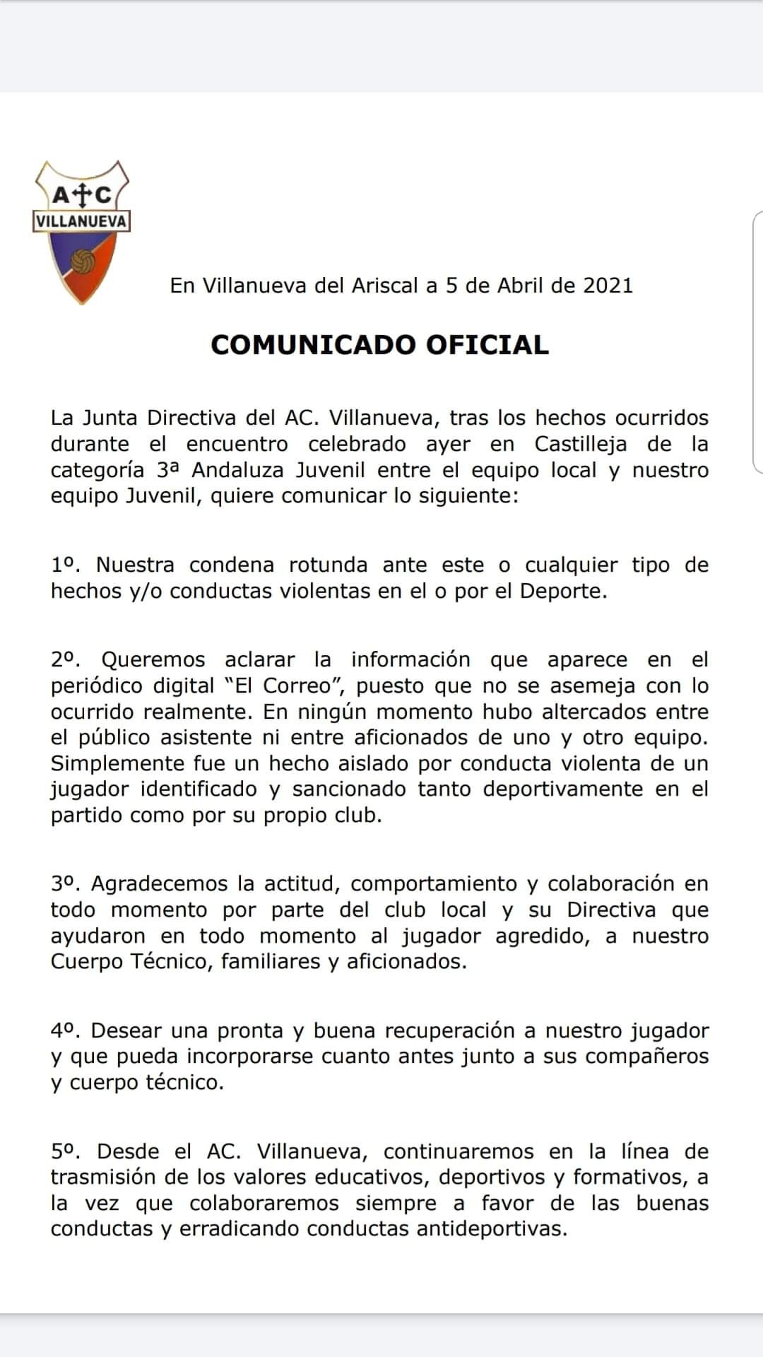 Nada justifica la violencia. Nunca. Nuestro apoyo al club y al jugador agredido, nuestros deseos de una pronta recuperación.
