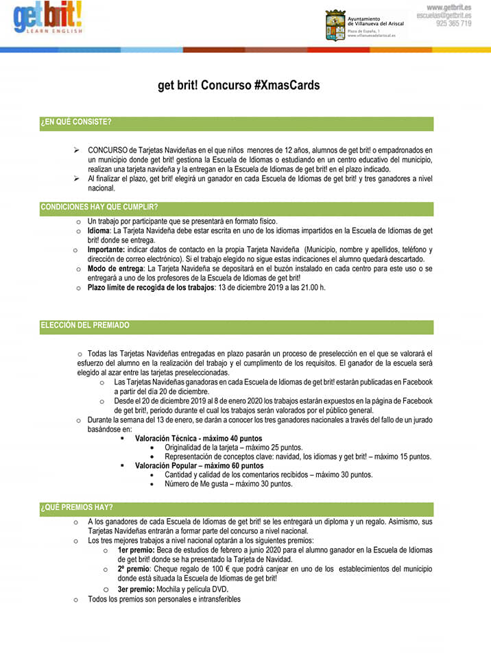 Aquí te dejamos el cartel y las bases del Concurso de Christmas organizado por Get Brit, la empresa que gestiona nuestra Escuela Municipal de Idiomas. Pueden participar todos los niños menores de 12 años de nuestra localidad. ¡Anímate y participa!